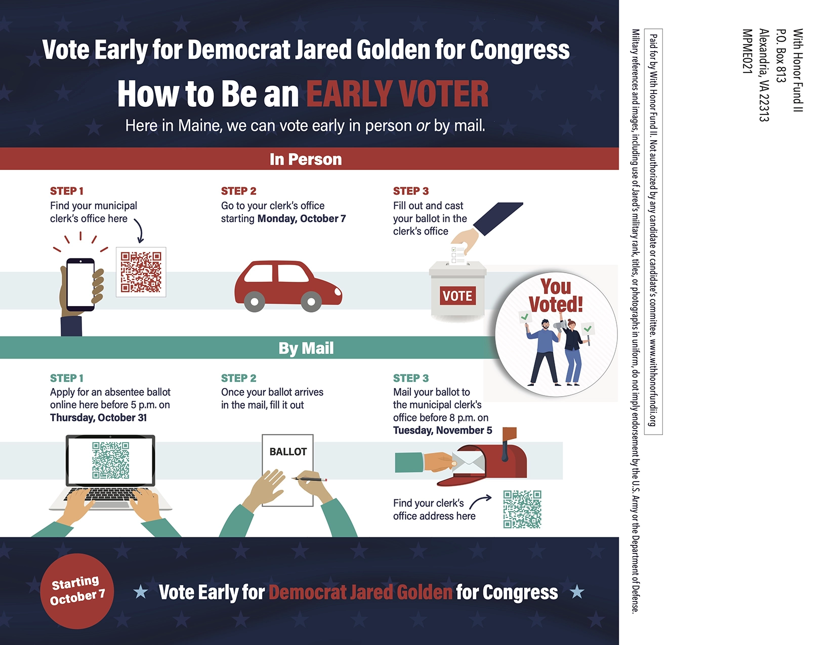 With Honor IE for Jared Golden for Congress (ME-2), 2024“Early Vote” (8.5 x11, Postcard) View larger image.